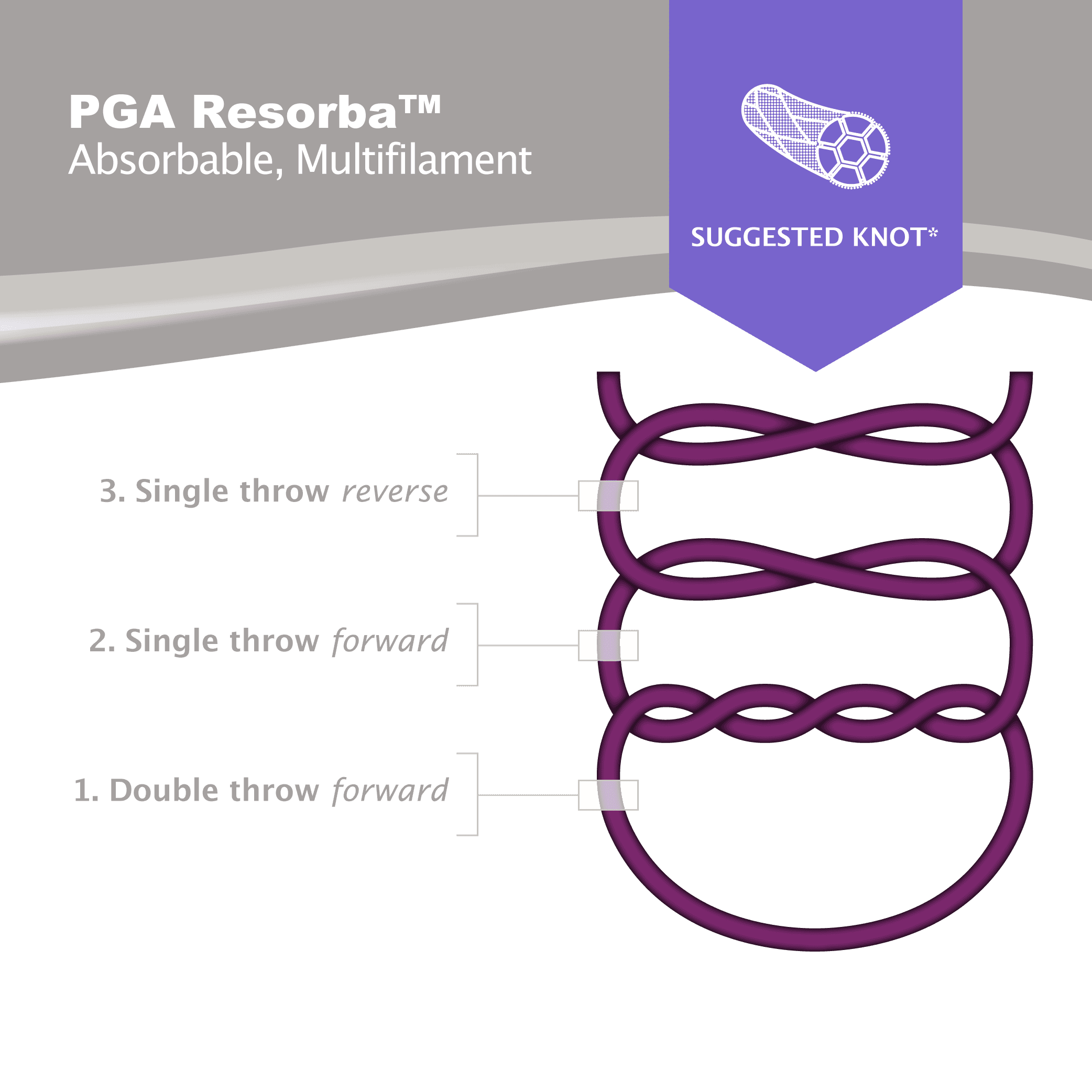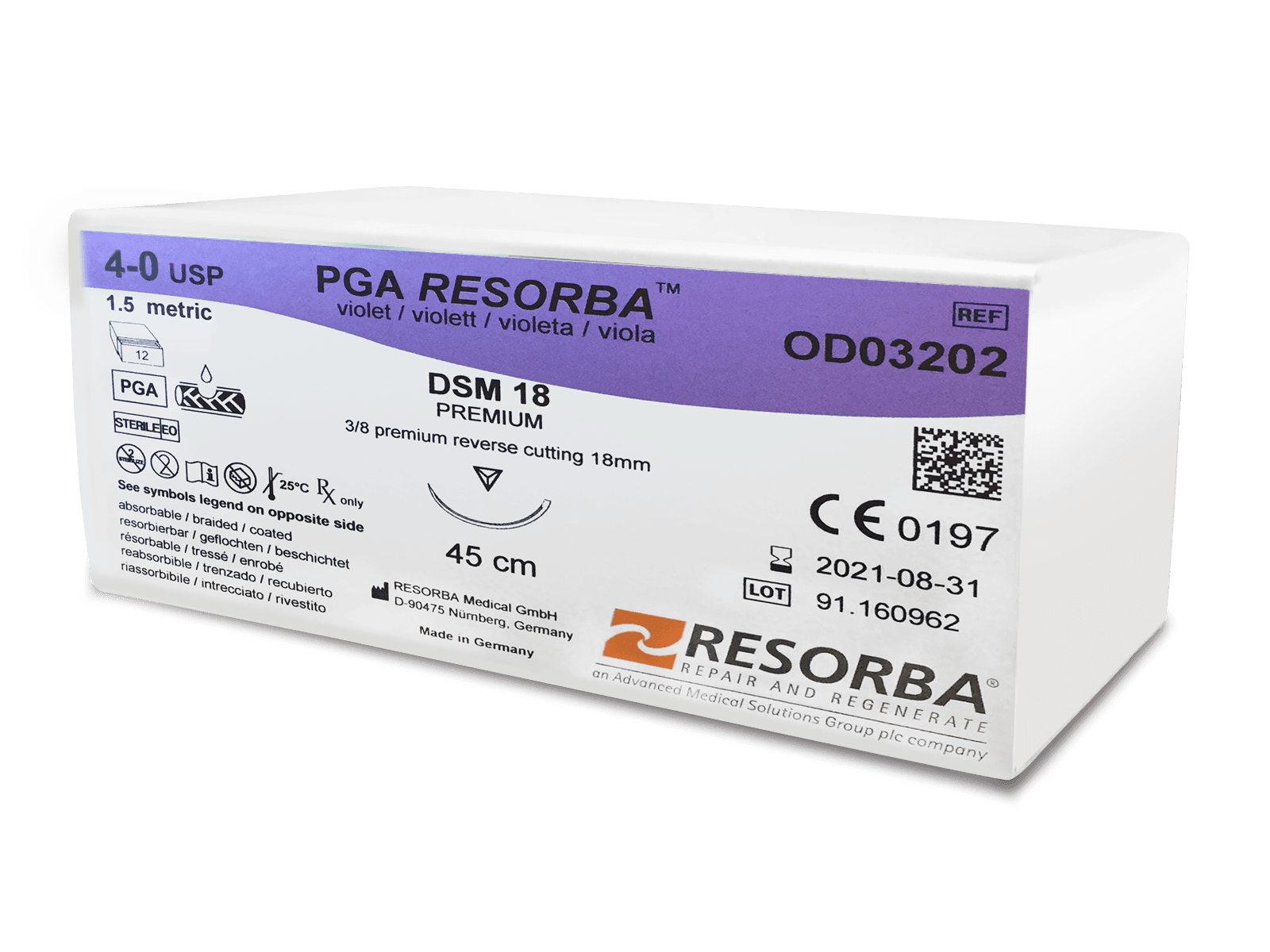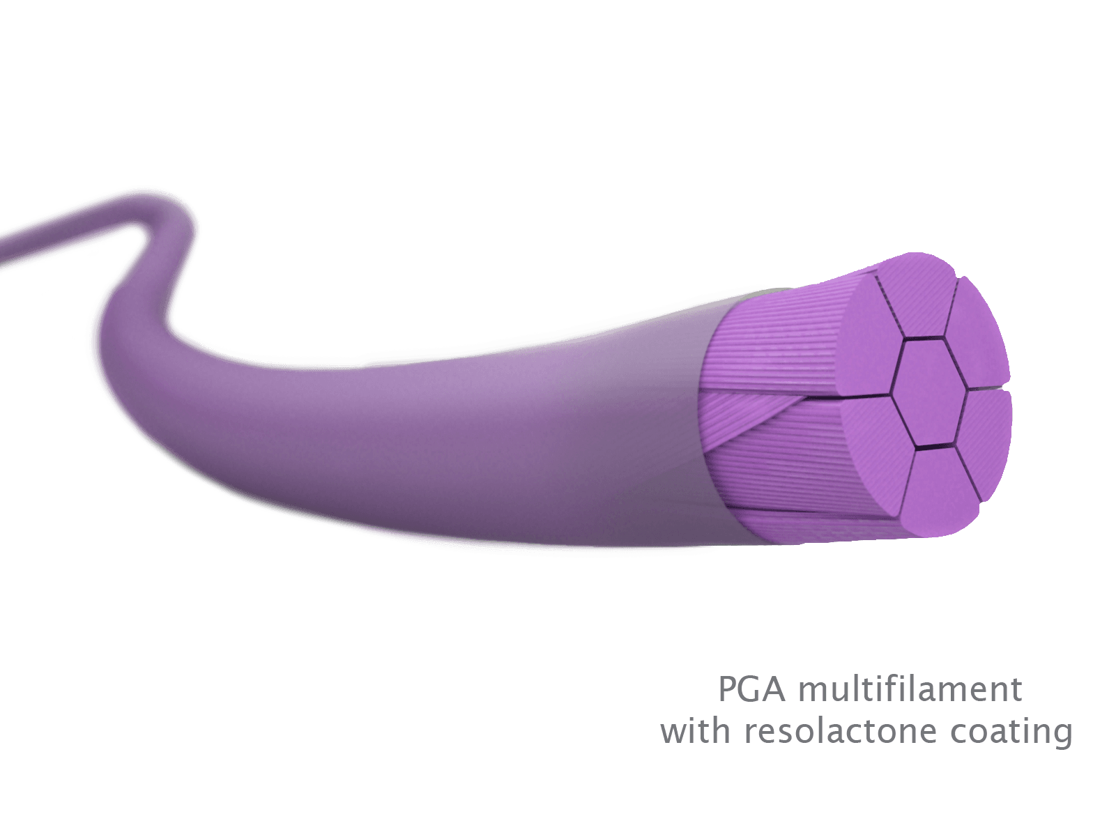 PGA Resorba™ is an absorbable suture made of precision-braided filaments of polyglycolic acid coated with a special resolactone coating to reduce surface friction when passing through tissue. The composition of PGA Resorba™ ensures predictable and moderately rapid resorption in tissue. PGA Resorba™ maintains 50% tensile strength for up to 21 days*.