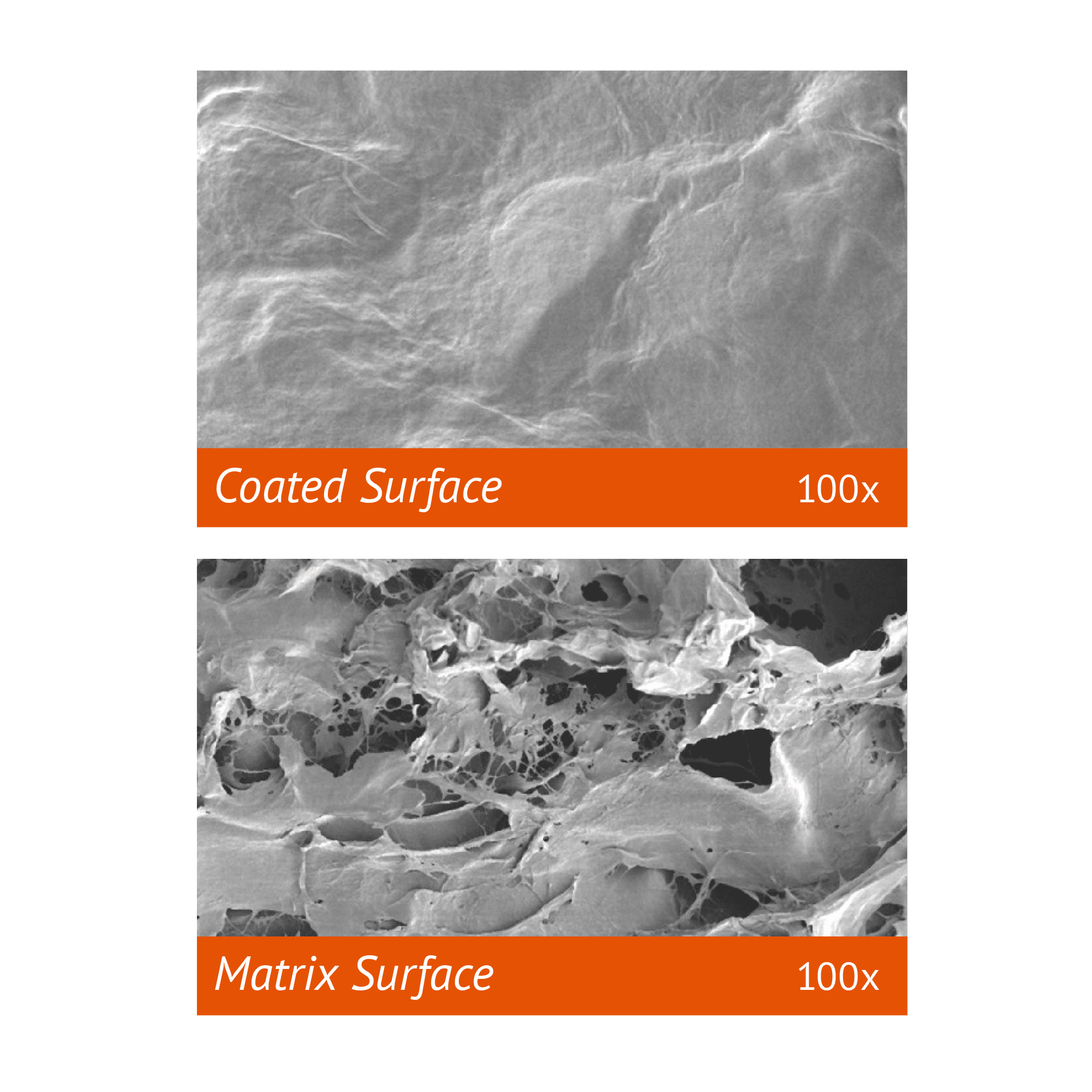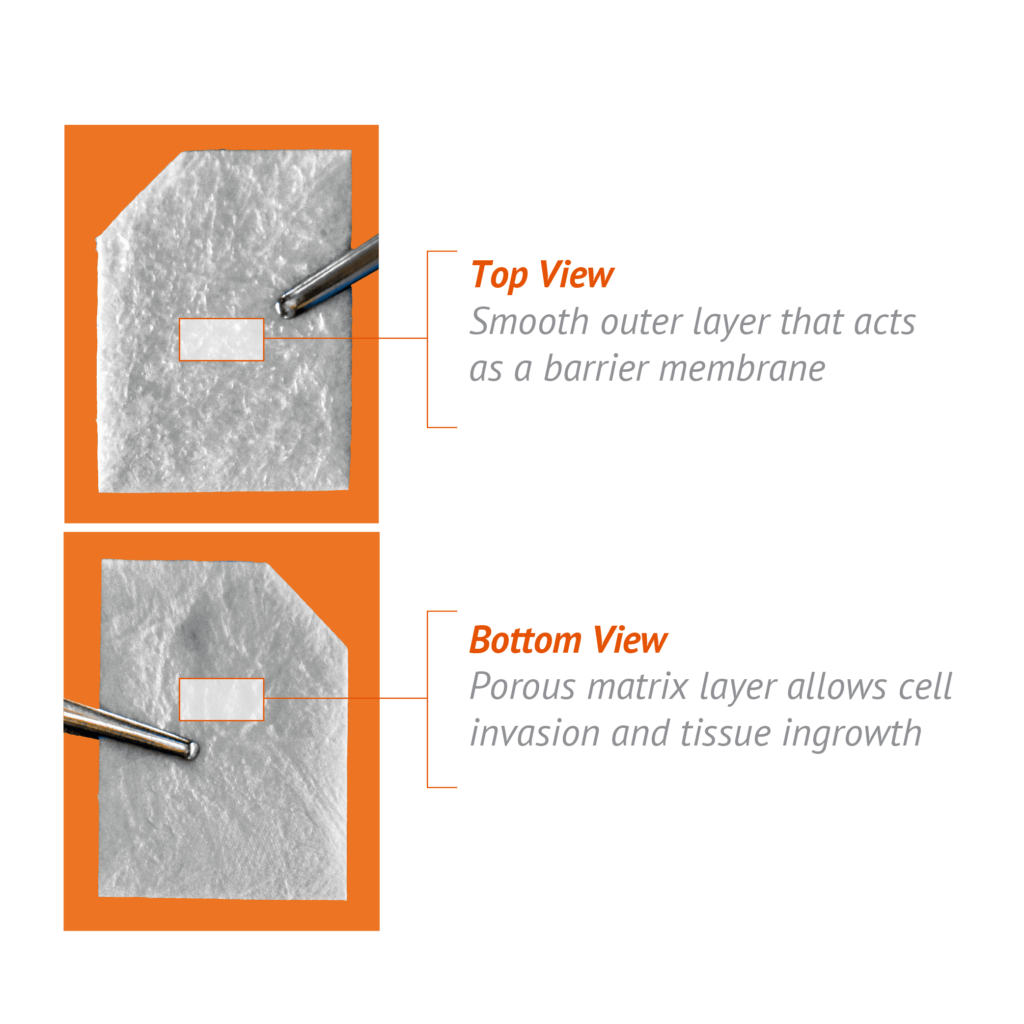 Designed to perform when left exposed* - The product is composed of two structures: a coated smooth outer layer that acts as a barrier membrane and a porous matrix layer to allow cell invasion and tissue ingrowth. The product is oriented so that the porous layer is in contact with the host tissue to facilitate tissue integration.