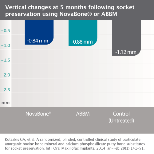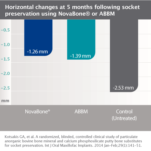 Unlike most synthetic grafts that are only osteoconductive, bioactive NovaBone® Dental Putty also has an “osteostimulative” effect. After implantation, surface reactions result in absorption of the graft material, a controlled release of Si, Ca, and P ions, and concurrent new bone formation. These surface reactions result in an osteostimulative affect, defined as the stimulation of osteoblast proliferation in vitro as evidenced by increased DNA content and elevated osteocalcin and alkaline phosphatase levels. In vitro gene array analysis has confirmed that when human primary osteoblasts are exposed to extracts of CPS, upregulation of several gene families occurs.