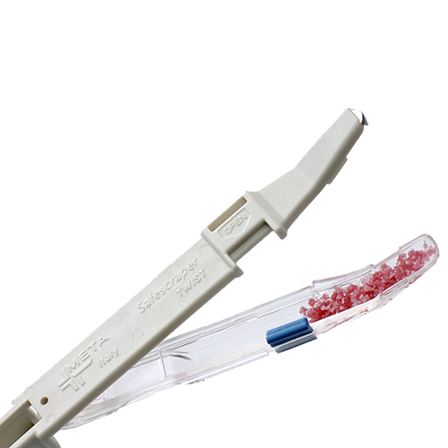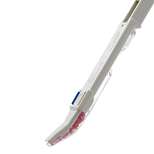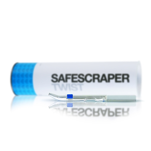 The curled bone shavings harvested with the scraper have a mean length of 1.3 mm and have the porosity and low density to allow angiogenesis. Because the bone is collected with coagulated blood, it displays a high biological plasticity shortly after it is harvested. This makes the graft extremely easy to handle and mold. The ergonomic design of the Safescraper® Twist allows clinicians the ability to easily harvest bone from intraoral sites with a minimally invasive approach. The sterile, disposable scraper makes providing your patients with mineralized cortical bone easier then ever before.