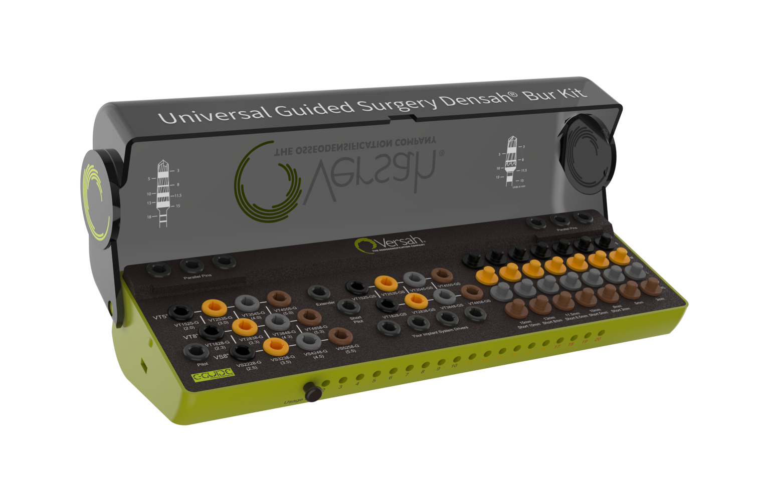 The Versah® Guided Surgery Holder is designed to organize and house all Densah® Burs, Short Densah® Burs, Tapered Densah® Pilot Drill, Short Tapered Densah® Pilot Drill, Versah® Drill Extender, Parallel Pins, Vertical Gauges and G-Stop® Keys.