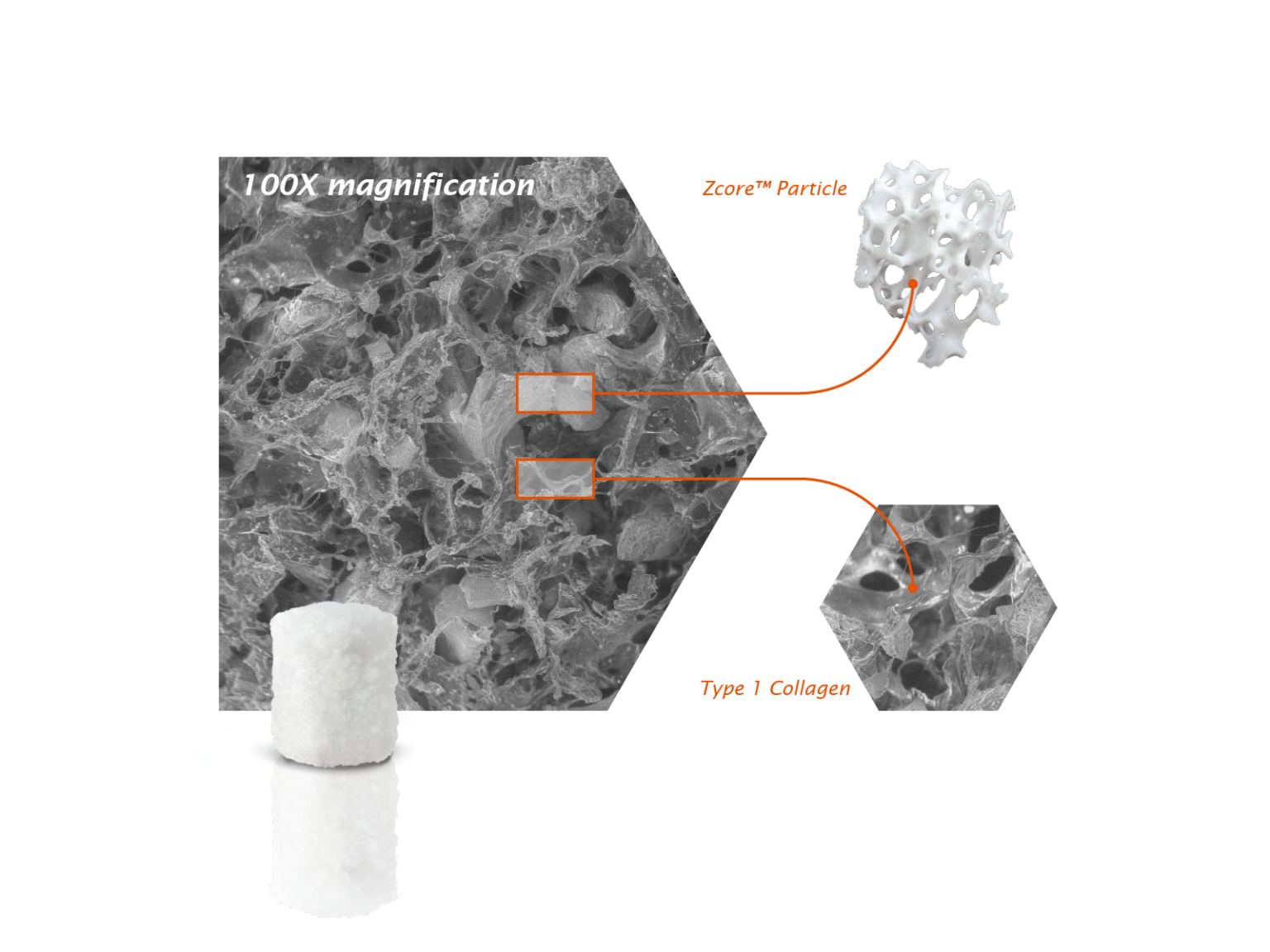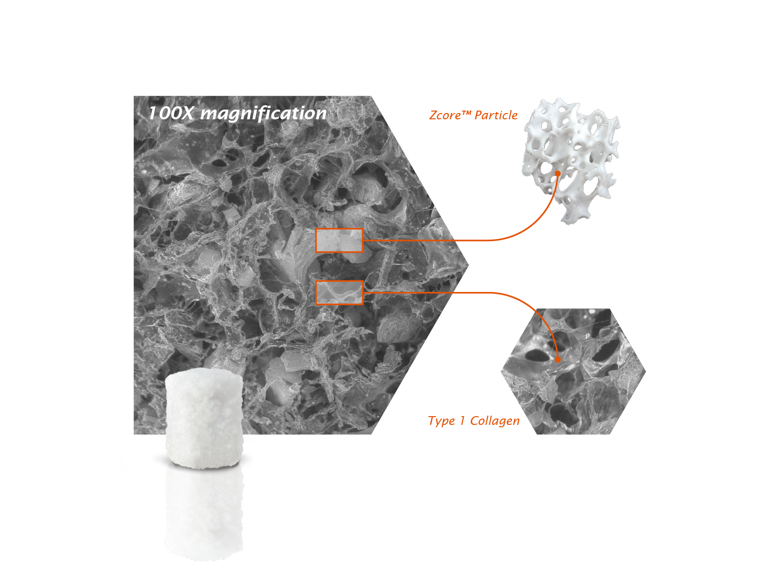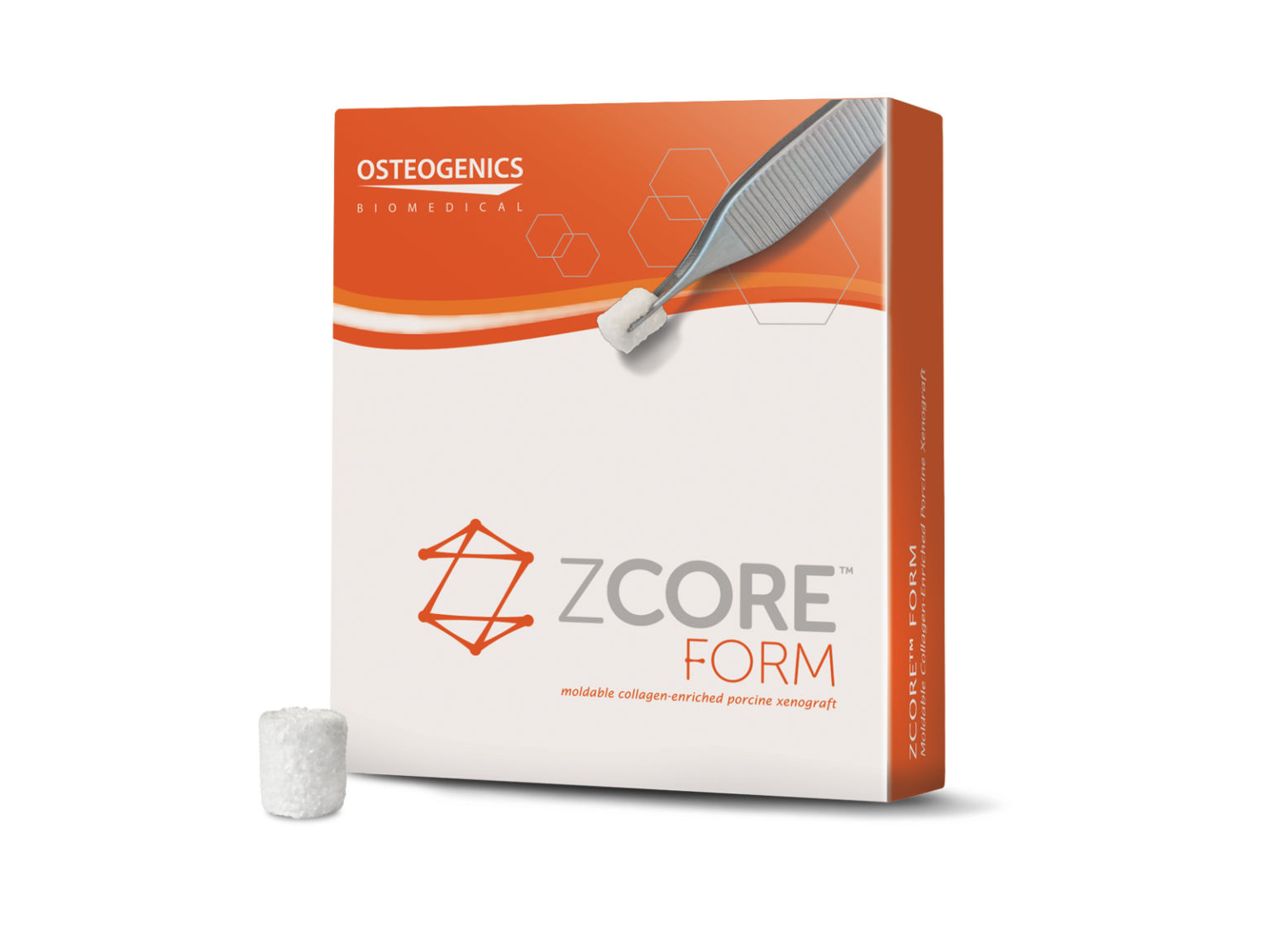 Zcore™ Form is a composite of osteoconductive bone mineral and collagen. Zcore™ Form is composed of 90% porcine xenograft particulate and 10% porcine collagen by weight. The moldable consistency of Zcore™ Form allows it to take the shape of the defect while also making the overall handling of the product easier and more convenient than particulate grafts.