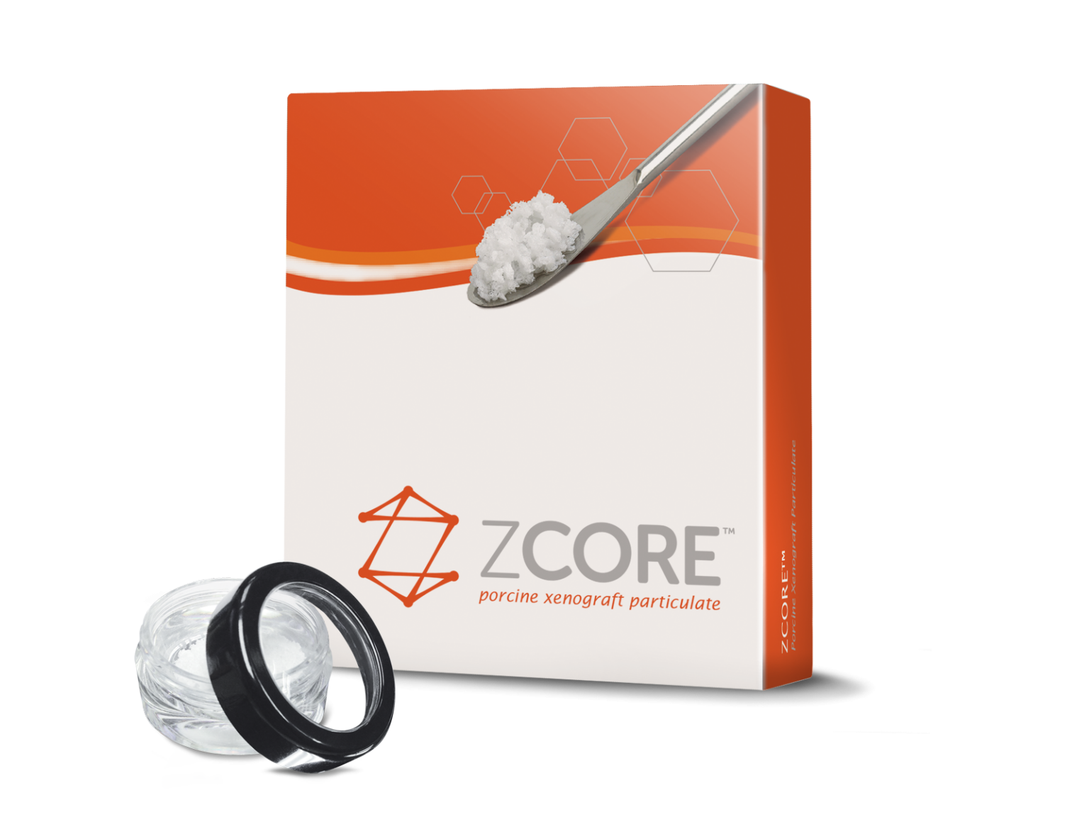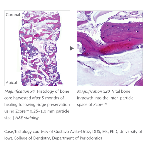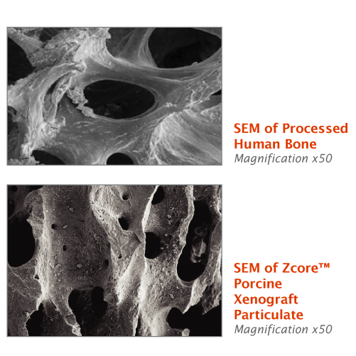 Zcore™ is an osteoconductive, porous, anorganic bone mineral with a carbonate apatite structure derived from porcine cancellous bone. Proprietary processing steps preserve both interconnecting macroscopic and microscopic porous structures of Zcore™ that helps support the formation and in-growth of new bone.